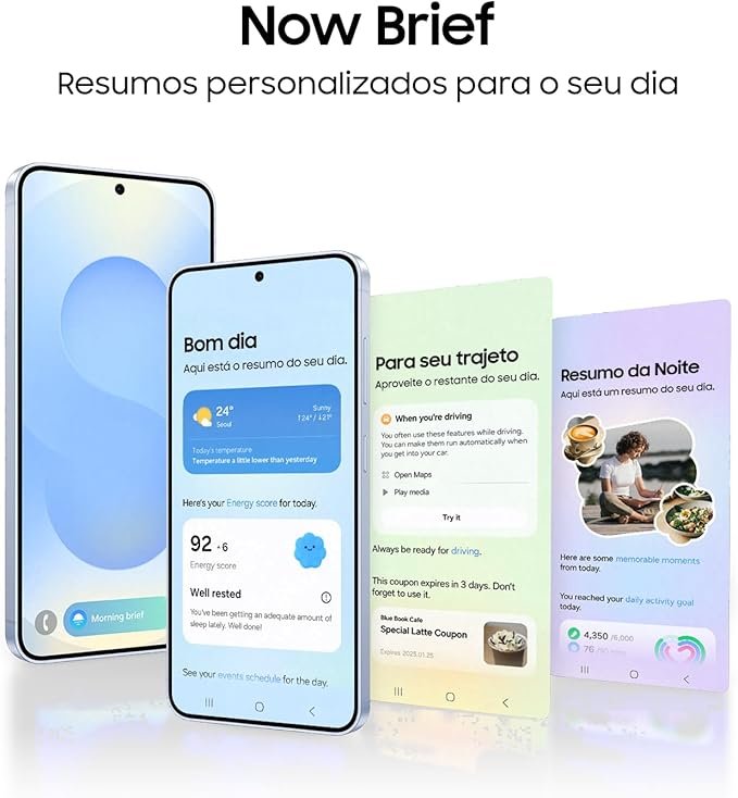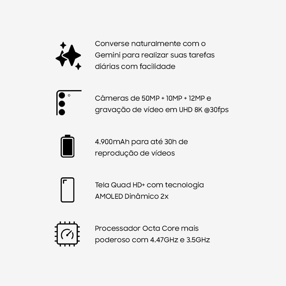 A Samsung apresenta o mais novo lançamento da linha S. Seu verdadeiro aliado AI, o Galaxy S25 é o novo celular com o poder da nova geração da inteligência artificial. Tenha em suas mãos uma nova experiência com Galaxy AI com seus novos recursos. Eleve o seu dia a dia, com assistência rápida e completa com os novos recursos de IA mais avançados, como traduções em tempo real, geração de texto e imagens, tudo isso com maior rapidez e privacidade, graças à execução de tarefas diretamente no dispositivo. Novas formas de realizar suas tarefas, se divertir, criar e cuidar da sua saúde. Um celular AI totalmente novo que auxilia sua vida diária com conversas em linguagem natural. Celular AI semelhante ao humano alimentado por agentes de IA e com diversos recursos ao seu alcance, com o Gemini Live, conclua instantaneamente várias tarefas de uma só vez com uma conversa natural tendo uma ação entre aplicativos. Conclua várias ações de uma só vez, falando naturalmente com a série Galaxy S25, que entende seus comandos de voz. Sincronize suas mensagens, calendários, texto apenas ativando um único comando. Obtenha facilmente informações, ações e soluções de que você precisa com base no contexto da sua tela. Encontre intuitivamente as informações de que você precisa com pesquisa na tela ou circule para pesquisar. A nova função Now Bar & Now Brief, ainda permite que você verifique as notificações para tarefas em andamento e receba um resumo diário de suas atividades. O Gravador de chamada é mais uma novidade no Galaxy S25, permite que você faça gravação de chamadas com transcrição e resumo no dispositivo. O Novo Galaxy S25 ainda conta com o processador mais poderoso da linha S. O Snapdragon 8 Elite for Galaxy (3nm) tem seu desempenho aprimorado de forma abrangente, oferecendo uma experiência móvel poderosa. O processamento de IA mais rápido em um Galaxy, fornecendo resultados de IA mais confiáveis do que nunca. Falando de câmera o novo Galaxy S25, permite que você tenha novas experiências de filmar e fotografar surpreendente com detalhes e cores mais vibrantes. Tenha o maior nível de detalhes em suas fotos e vídeos, independentemente da lente que você estiver usando. Vídeos Nightography destacam inúmeros detalhes. Imagens vibrantes e realistas, Reconhecimento perfeito do tom de pele com o Object-Aware Engine. O Assistente de fotografia dentro do novo Galaxy S25 ainda conta com novas funcionalidades. O eliminador de áudio ajuda a remover ruídos indesejados em seus vídeos e a uma nova função para você reproduzir a magia do cinema no Studio combinando fotos e vídeos da galeria em novos projetos de filmes. A linha Galaxy S25 ainda conta com a sua identidade de design única da série S, ultra elegante, molduras mais finas e uniformes para visualização mais ampla e usabilidade mais confortável. Sua durabilidade excepcional possui materiais meticulosamente selecionados para um design premium e durável. Seu acabamento em alumínio forte com dureza incrível para o S25 e S25+. E para a versão Ultra acabamento em Titânio. O metal mais resistente já usado na série Galaxy. Vidro resistente “Corning Gorilla Armor” para maior durabilidade (Resistência a arranhões e choques). Brilho adaptável garantindo uma visualização suave e confortável. O novo Galaxy ainda conta com um mix de Cores luminosas inspiradas na natureza, sendo elas: Azul, Verde, Prata e Azul Marinho para a versão básica e Plus. Já nas versões do modelo Ultra, as cores são Titânio Preto, Titânio Cinza, Titânio Prata, Titânio Azul. Com o aplicativo Smart Switch você transfere de forma fácil e prática o conteúdo do seu celular anterior (fotos, contatos, eventos do calendário, notas, configurações do dispositivo e muito mais) para o novo Galaxy S25. Para sua melhor segurança não deixe de conferir as ativações do Cadeado Galaxy, tenha seus dados e seu celular seguro e protegido. *Acesse: www.cadeadogalaxy.com.br
