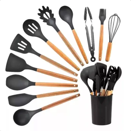 Apresentamos o Kit Utensílios De Cozinha 12 Peças Bambu Silicone Resistente Cor Preto, da marca Jogo Colheres Madeira Siliconado. Este conjunto de utensílios de cozinha é a combinação perfeita de funcionalidade e estilo, com um design elegante e moderno na cor preta.