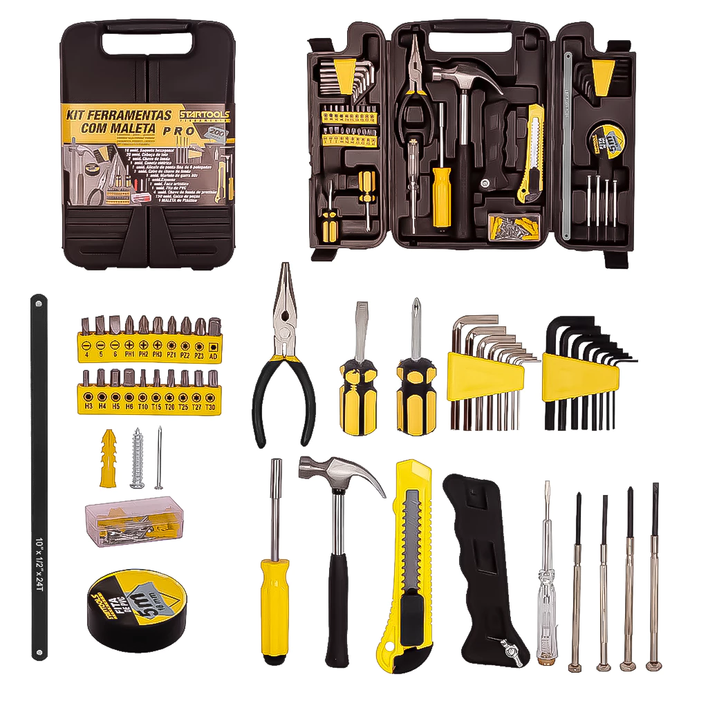 A Maleta De Ferramentas, conta com 200 peças e é composto por ferramentas robustas e com alta qualidade, sendo fabricadas em aço carbono especial, garantindo maior vida útil e resistência.
