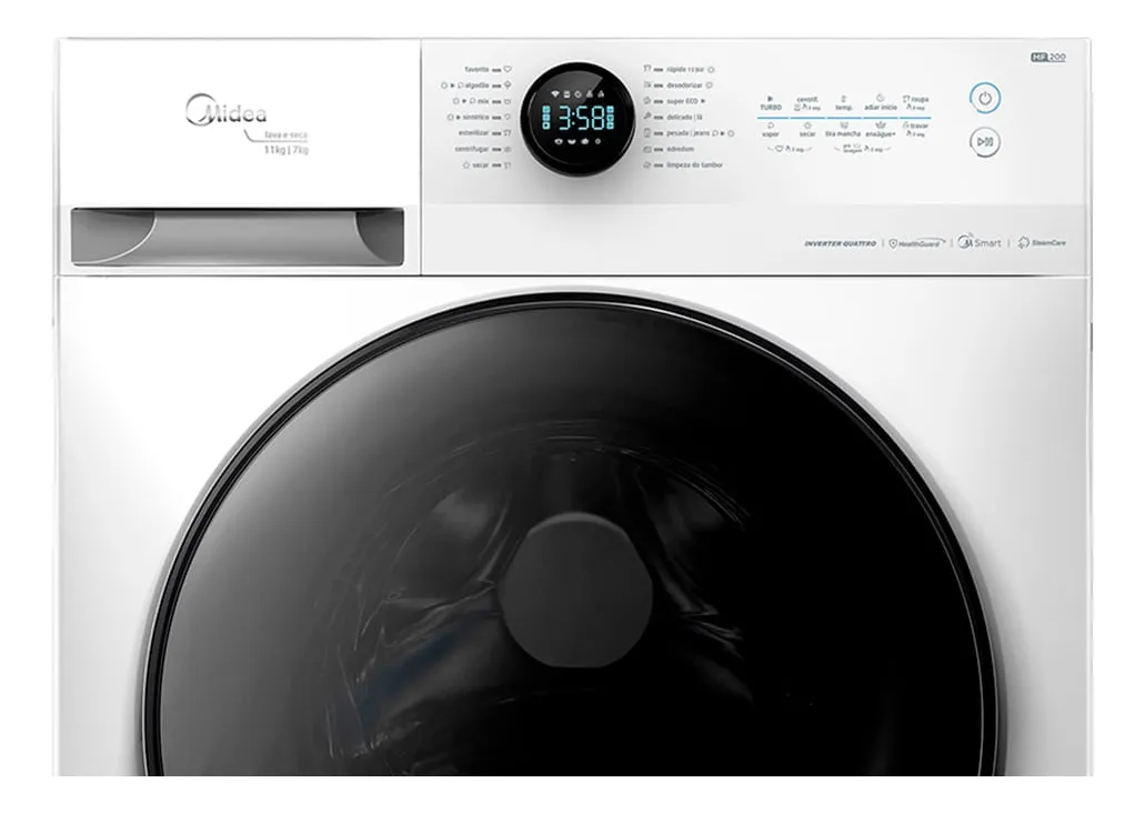 A Lava e Seca HealthGuard Smart 11 Kg Midea é uma aliada na lavanderia que cuida das roupas e do bem-estar. Com a tecnologia HealthGuard, proporciona limpeza e esterilização profundas nos programas pré-selecionados. Possui conectividade via app, conexão wi-fi e comando de voz, permitindo controlar a máquina a qualquer hora e lugar. Com motor Inverter Quattro, oferece um ambiente mais silencioso e econômico. Conta com 14 programas e 9 funções, Painel Touch e botão Lunar, que integram as funções do botão e da tela. Inclui Função Turbo, com ciclos até 40% mais rápidos. Dispõe de limpeza do tambor e Spray, que remove resíduos de sabão da porta e das roupas, garantindo uma limpeza abrangente. Health Guard oferece tecnologias de limpeza e esterilização. Auto clean é um ciclo de limpeza automático que elimina resíduos da parte superior do tambor durante a lavagem. Steam Care utiliza vapor em alta temperatura para esterilização antes do ciclo de lavagem. Conectividade via aplicativo Midea MSmartHome permite escolher programas, temperatura e intensidade do ciclo, além de informar o tempo restante e notificar quando as roupas estão limpas e secas. Compatível com Alexa e Google assistente. Motor Inverter Quattro é mais eficiente, durável, silencioso e econômico. Painel Touch adiciona sofisticação à lavanderia. Botão lunar oferece uma experiência única. Função Turbo acelera os ciclos. A velocidade varia de acordo com o programa. Limpeza do tambor utiliza altas temperaturas para eliminar germes e bactérias. Spray ajuda na remoção de odores das roupas. Com 14 programas e 8 funções para facilitar o dia a dia.