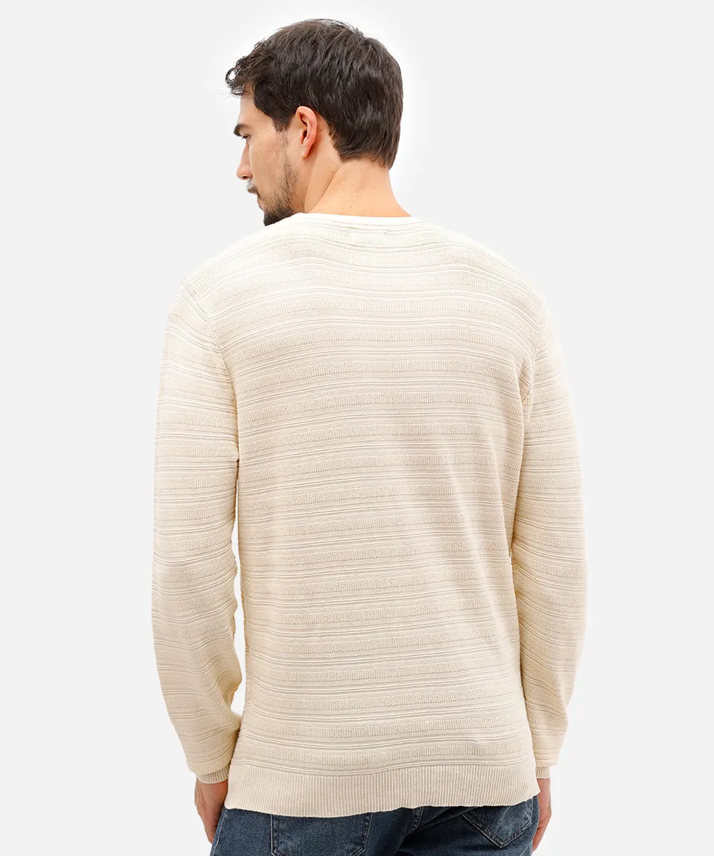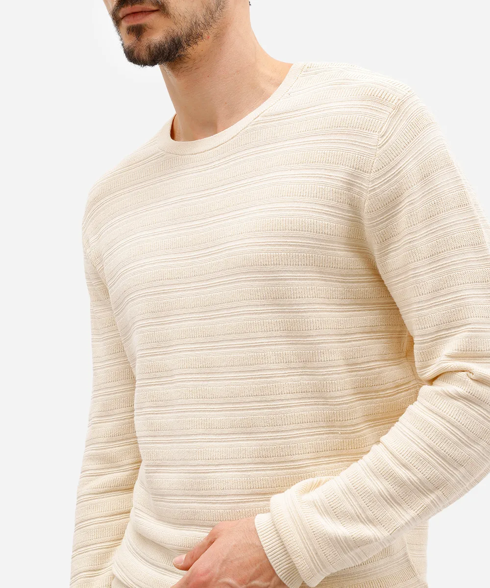 Suéter masculino confeccionado em tricot leve texturizado de algodão e poliamida. A peça tem a modelagem e construção reta e o caimento é confortavelmente solto ao corpo. O modelo tem gola redonda e mangas longas. Detalhe de acabamento canelado nos punhos, barra e gola. Composição: 80% algodão, 20% poliamida Modelo veste: M Medidas do modelo: Altura: 1,86cm Tórax: 101 cm Cintura: 76cm Quadril: 94cm. Instruções de lavagem: – Temperatura até 40º – Não alvejar – Secar em secadora – Secar na vertical – Passar em temperatura alta – lavar à seco